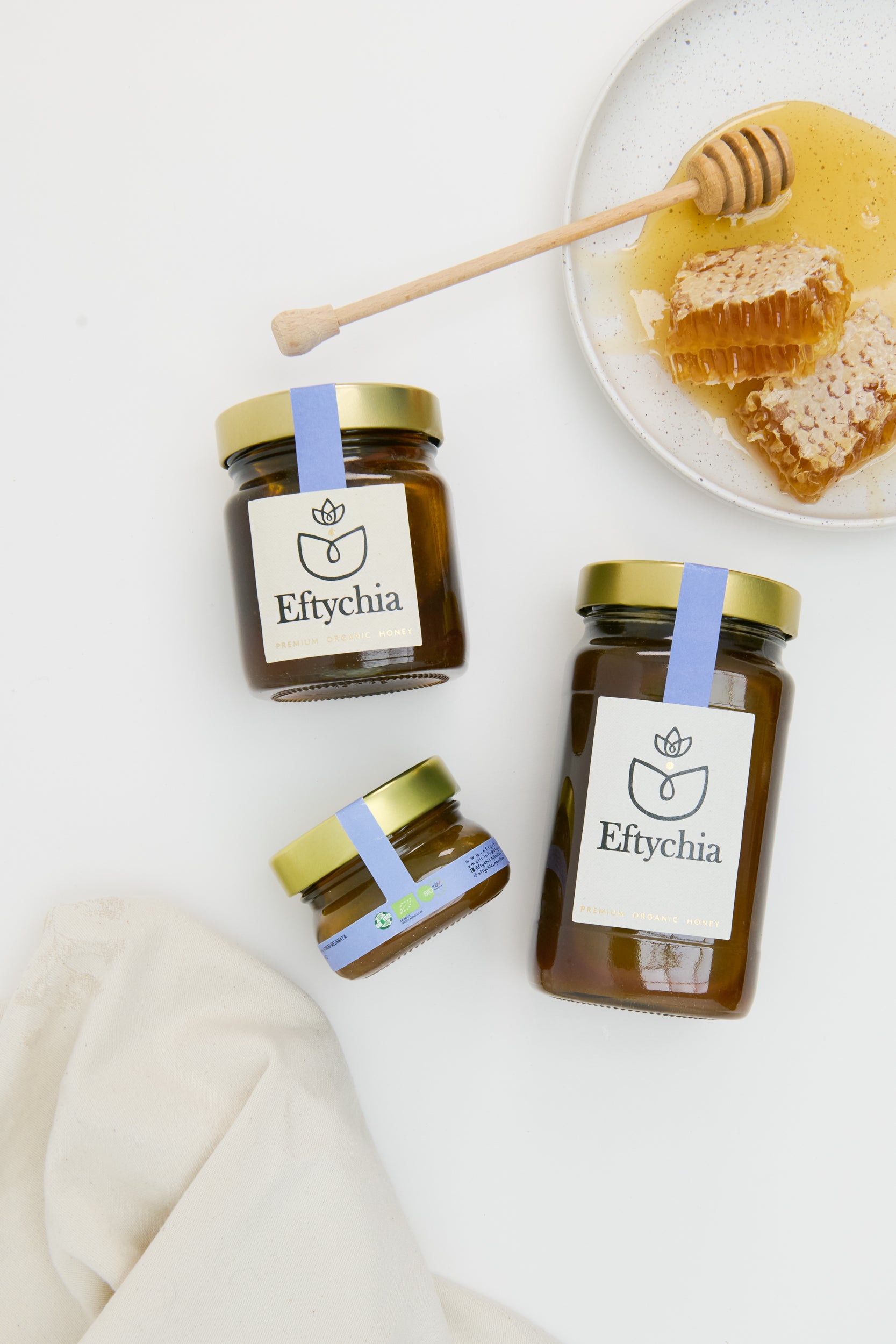 Eftychia steht für 100% naturbelassener Bio-Honig aus Griechenland - direkt aus der Wabe, schonend verarbeitet für vollen Geschmack.